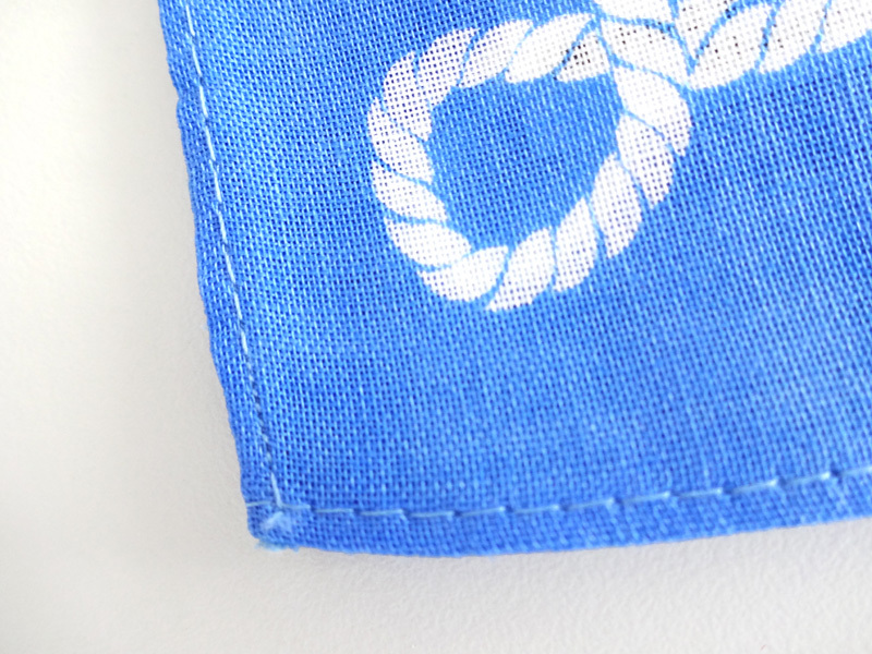 弊社で製作するバンダナはコンパス生地(綿100%)を使用しております。縦横ともに40番手糸を使用しており、バンダナとしては発色性もよく吸水性に富んだ最も相応しい生地です。